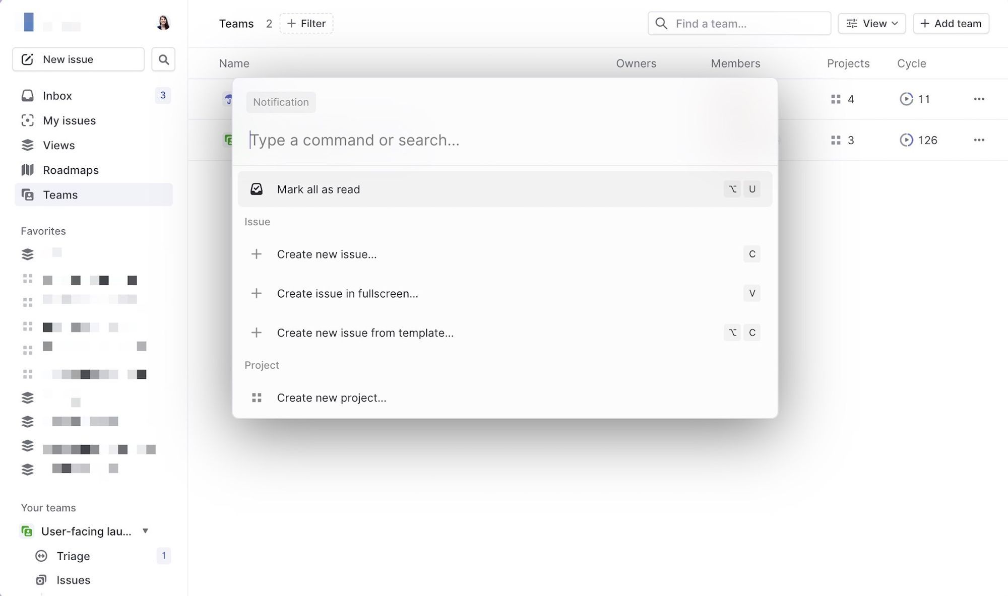 Fuzzy search in Linear lets you find actions without needing the exact name